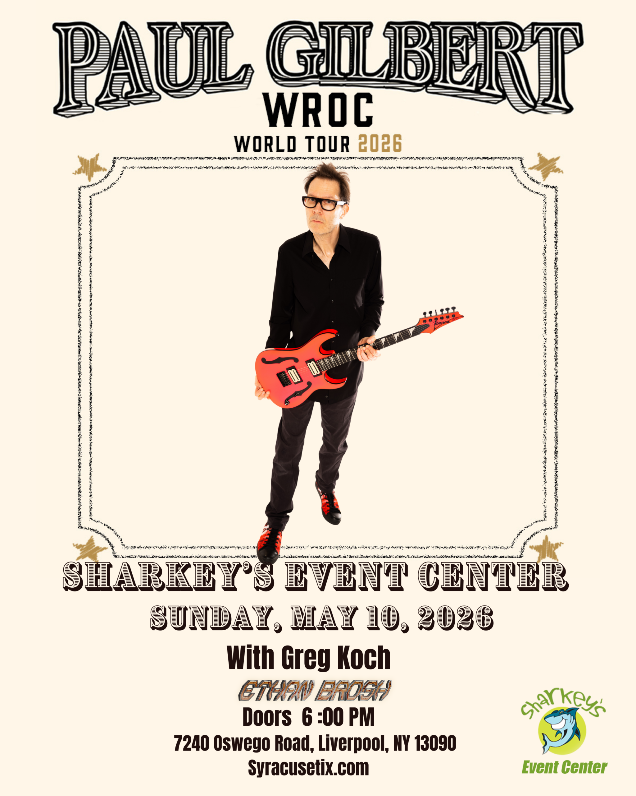 Sharkey's, under the Burritt Motors Pavilion Liverpool, NY, United StatesPaul Gilbert with Special Guests Greg Koch & Ethan Brosh Sunday, May 10 A rare opportunity to experience three world-class guitarists on one stage. Paul Gilbert is an American hard […]