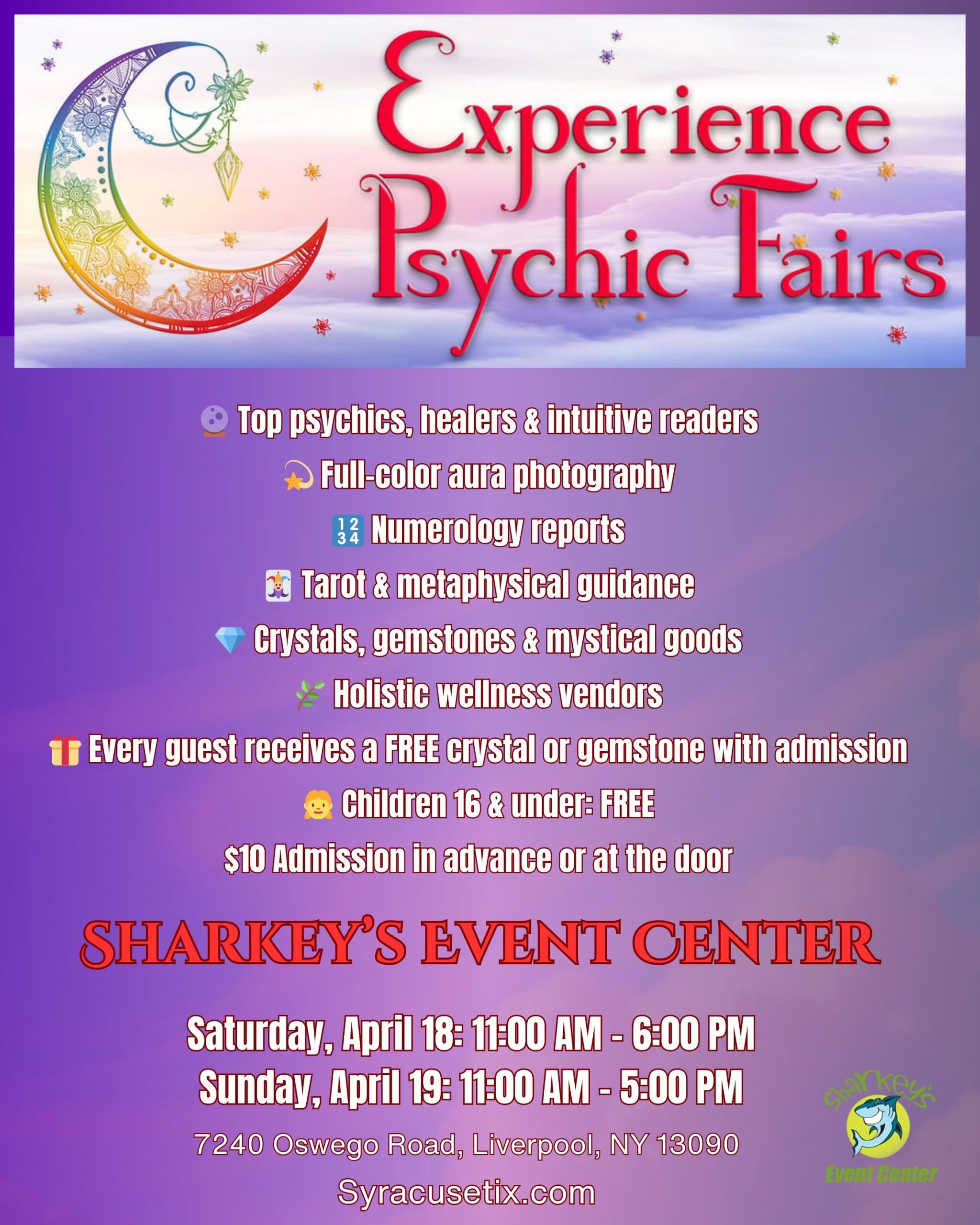 Sharkey's, under the Burritt Motors Pavilion Liverpool, NY, United States✨🔮 Experience Psychic Fair is coming back to Syracuse. Join us at our newest Syracuse location for a weekend of insight, magic, and spiritual discovery at Sharkey’s Event Center! 📍 […]