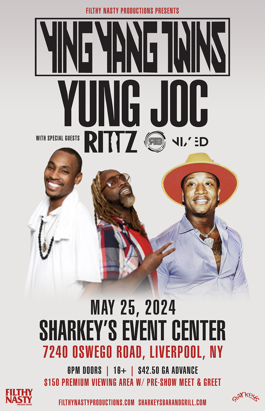 Ying Yang Twins & Yung Joc Co-Headline w/ special guest Rittz Sharkey's Event Center, Liverpool, NY.  Saturday, May 25, 2024 Hi Everyone! Here is Tonight’s Schedule for the Ying Yang Twins and Yung Joc 5:30pm Doors 6:15-6:35 = Nixed 6:50-7:15 = Raw Breed 7:30-8:10 = Rittz 8:25-9:15 = Yung Joc 9:30-10:30 = Ying Yang Twins […]