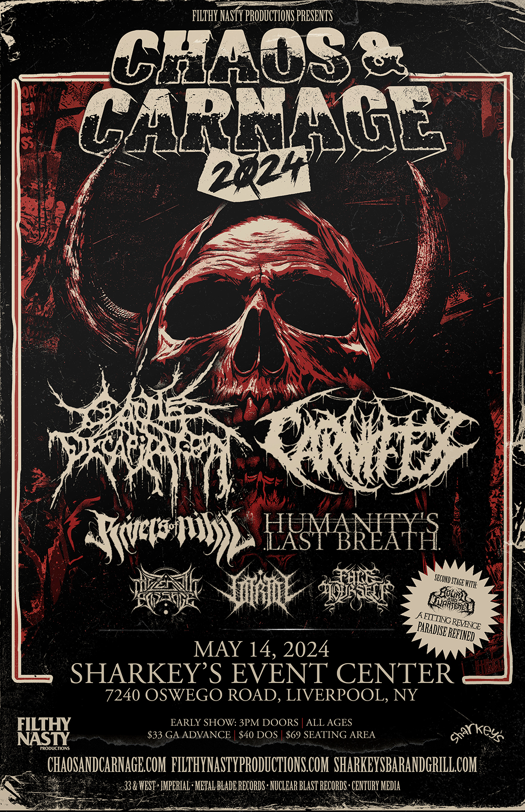 Today’s schedule Main Stage Time Side Stage Time DOORS 2:30PM Sarchosuchus 3:00:-3:20 Face Yourself 3:20-3:45 A Fitting Revenge 3:45-4:05 Vitriol 4:05-4:35 Paradise Refined 4:35-4:55 The Zenith Passage 4:55-5:25 Bound & Quartered 5:25-5:45 Humanity's Last Breath 5:45-6:25 Rivers Of Nihil 6:40-7:20 Carnifex 7:40-8:30 Cattle Decapitation 8:55-10:00   Experience the ultimate metal mayhem at the Chaos […]