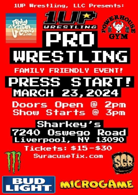 1UP Wrestling presents its very first full length professional wrestling event on March 23, 2024! Live, from Sharkey’s Event Center in Liverpool, New York. Doors will open at 2pm, and bell time is 3:05pm. 1UP brings you the very best in independent professional wrestling. With wrestling athletes such as “Moonlight Son” Mike Skyros, “The Natural” […]