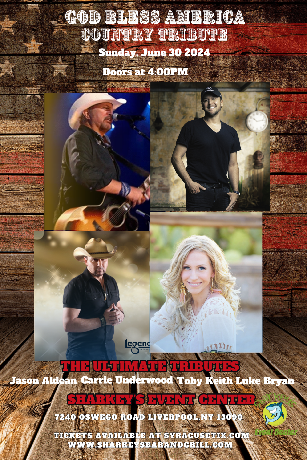 Day of  show. Tickets are available at the doors! GA Standing- $30 Preferred Seated front of Stage -$40 Tables of 8 -$350 Under the covered pavilion.   Sunday, June 30 Sharkey’s Event Center is proud to present God Bless America, the ultimate country tribute to Jason Aldean, Carrie Underwood, Toby Keith and Luke Bryan. Doors […]