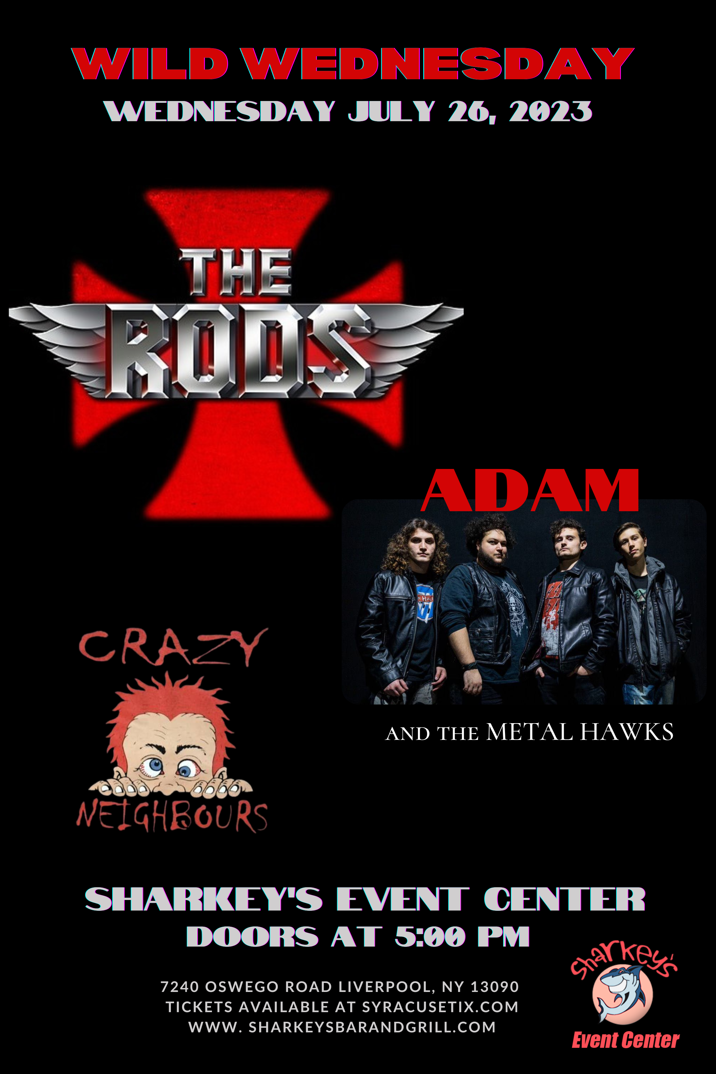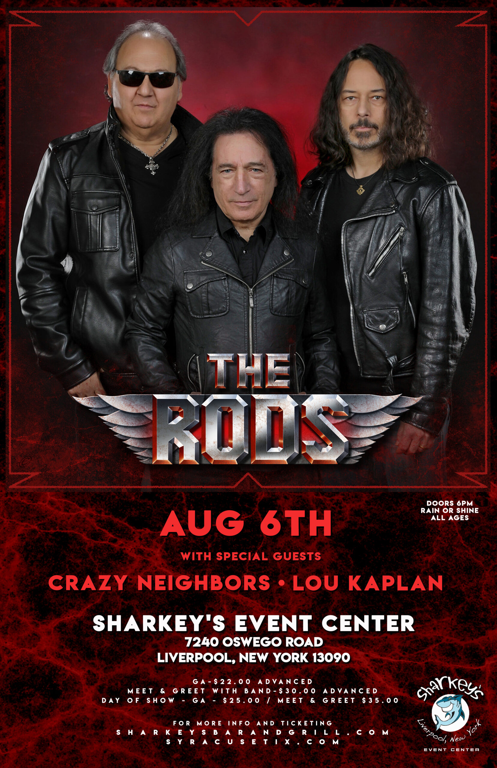 Sharkey's Event Center Liverpool, NY, United StatesThe Rods with special guests Crazy Neighbors and Lou Kaplan Date: Saturday August 6, 2022 Doors: 6:00 PM All Ages Rain or Shine Sharkey’s Event Center 7240 Oswego road Liverpool, New York 13090 General Admission - $22.00 advance sale / Day of show -$25.00 VIP (seated) includes pre-show Rods Meet & Greet Advance sale- […]