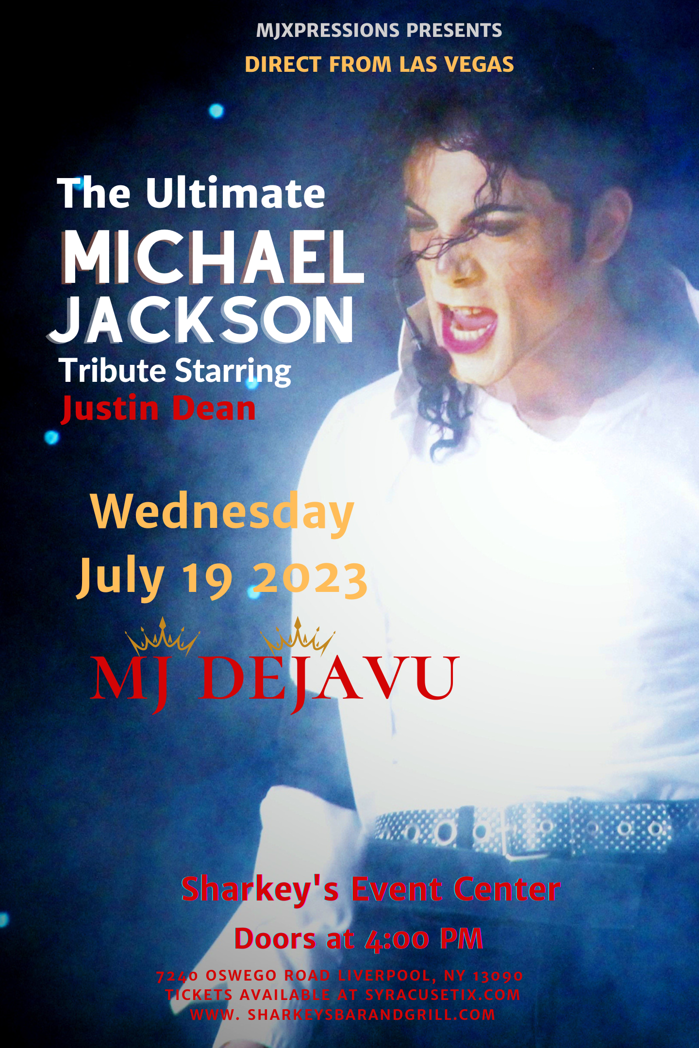 Sharkey's, under the Burritt Motors Pavilion Liverpool, NY, United StatesFor tonight’s show, doors open at 5:00 PM. Please come and enjoy dinner and drinks prior to showtime at 7:45 PM. MJ Dejavu, is set to take Sharkey's by storm on Wednesday, July 19th! Starring the electrifying performer, Justin Dean, this show celebrates the music and dancing of the iconic 'King of Pop', Michael Jackson. […]