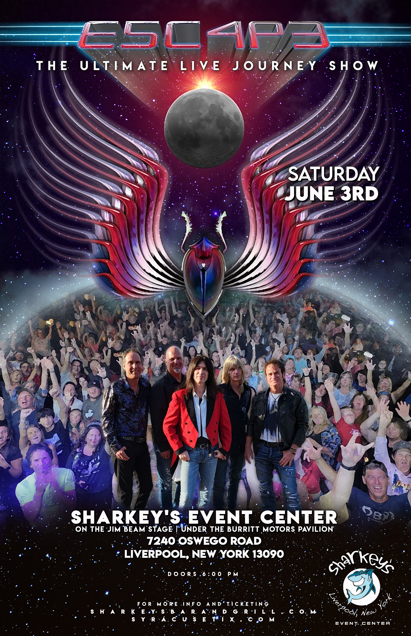 Sharkey's, under the Burritt Motors Pavilion Liverpool, NY, United StatesESCAPE, consistently rated as the Number One Journey Tribute Band is coming to Sharkey's on Saturday, June 3, 2023! ESCAPE features five of California’s top tier rock musicians. Individually, the various members of Escape have played in original bands with current or former members of Toto, Foreigner, ELP, Heart, Bad Company, Deep Purple, Yes, Black […]
