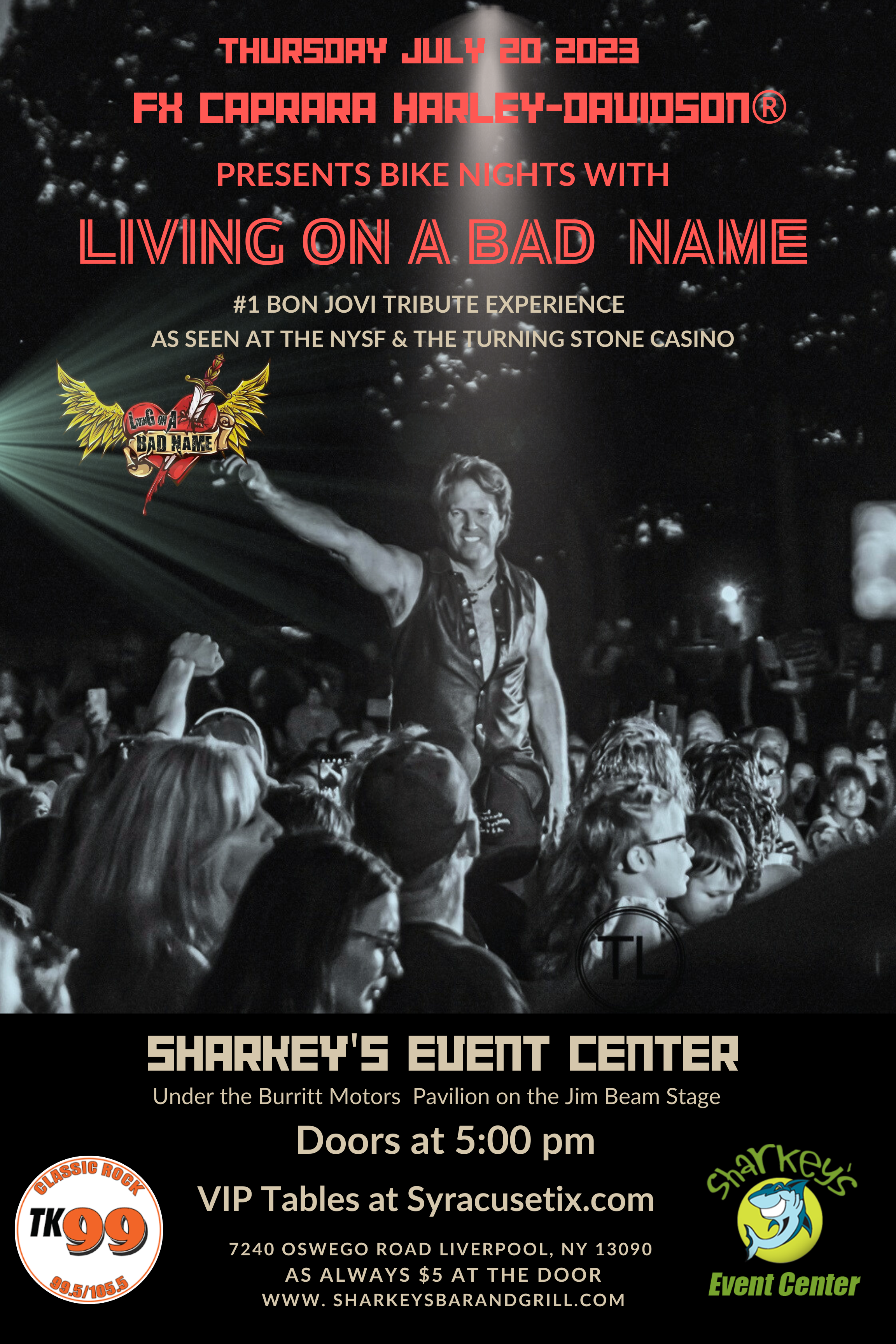Sharkey's, under the Burritt Motors Pavilion Liverpool, NY, United StatesRev up your hogs and get ready to embark on an exhilarating journey as FX Caprara Harley-Davidson proudly presents a special Bike Night, Thursday July 20, 2023, featuring Living on a Bad Name, the number one Bon Jovi tribute band! Get ready to be transported back to the glory days of one of the greatest […]