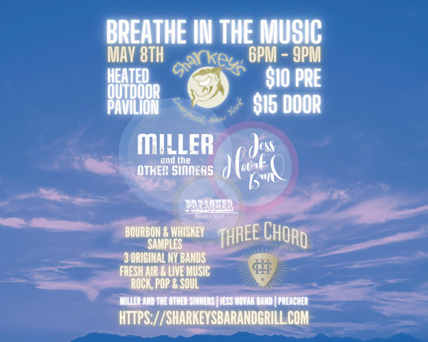 Sharkey's, under the Burritt Motors Pavilion Liverpool, NY, United StatesMay 8th, 6 pm - 9 pm Heated Outdoor Pavilion Bourbon and Whiskey Samples from Three Chord 3 Original New York Bands Fresh Air Live Music Rock, Pop, and Soul! Preacher The Jess Novak Band Miller and the Other Sinners