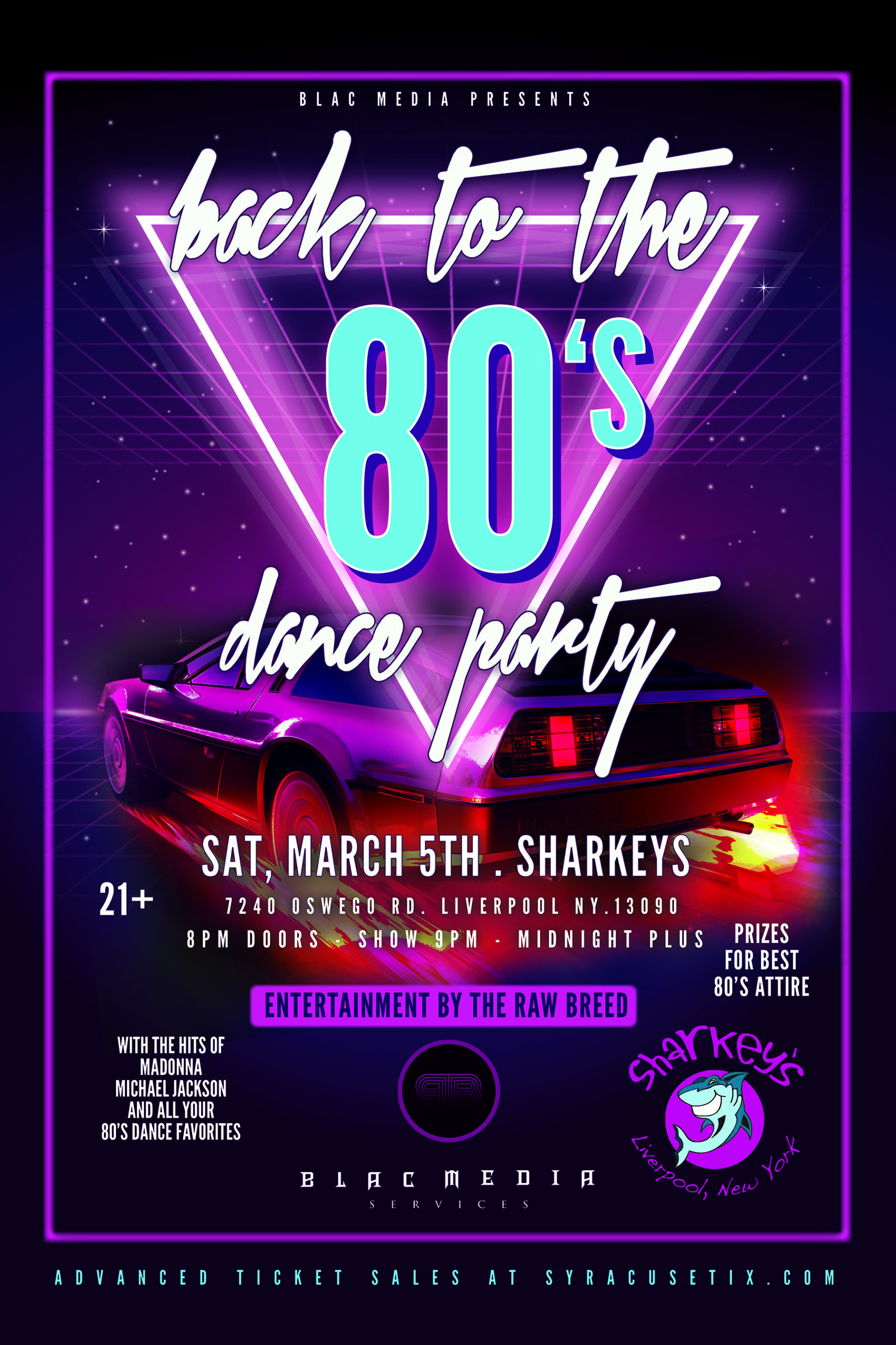 Sharkey's Event Center Liverpool, NY, United States21 and over Prizes for best 80s attire Tickets available at the door. 8pm Doors Show 9PM- Midnight Plus With the Hits of Madonna Michael Jackson and all of your 80s dance favorites Featuring the DJs of Raw Breed.
