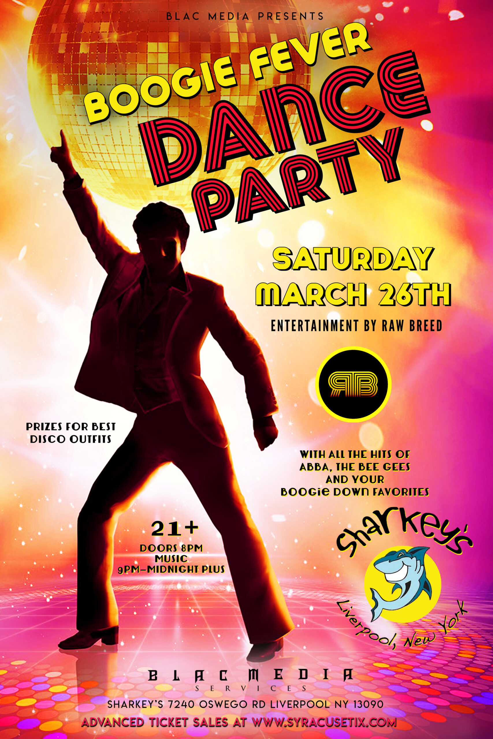 Sharkey's Event Center Liverpool, NY, United States21 and over Prizes for the best disco outfits With the hits of Abba, The Bee Gees and your Disco Favorites Featuring the DJs of Raw Breed.